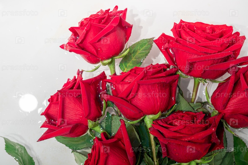 Букет свежих мокрых красных роз в воде на светлом нейтральном фоне крупным планом. День святого Валентина, день матери, свадьба, день рождения. Праздничный творческий фон. Горизонтальный формат