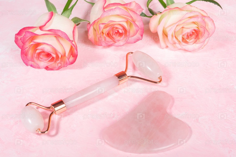 Розовый кварцевый камень Гуаша скребок и роликовый массажер для лица и розы на розовом. Набор ручных инструментов для антивозрастного, лифтингового, лимфодренажного массажа лица Альтернативный уход за красотой Крупным планом