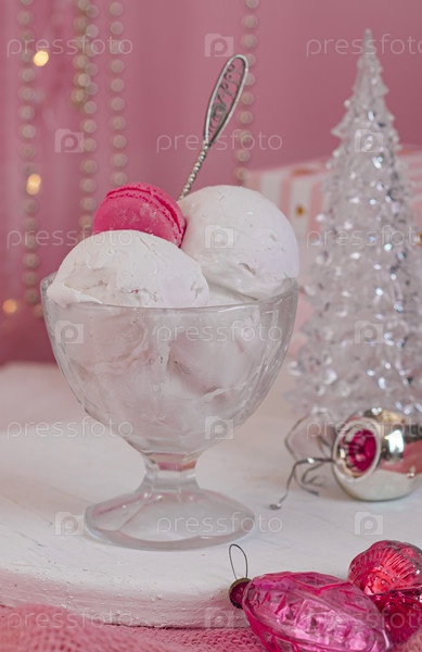 Сливочное мороженое в креманке на розовом фоне. Новый год