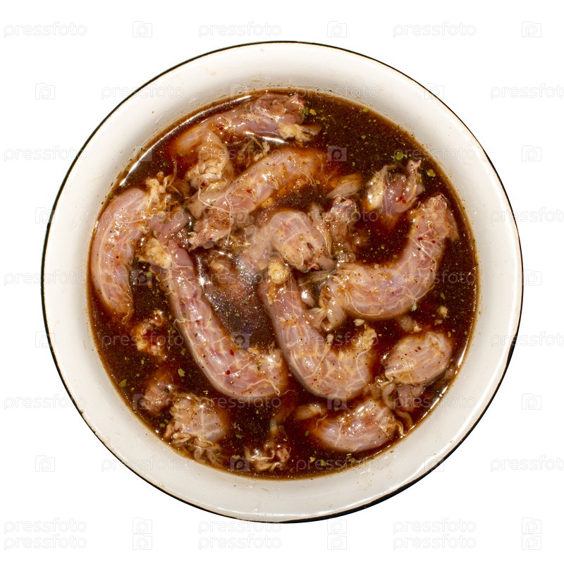 Сырой куриный шейк в маринаде вид сверху.Chicken neck soaked in marinade