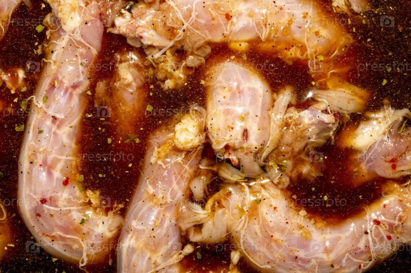 Сырой куриный шейк в маринаде вид сверху.Chicken neck soaked in marinade