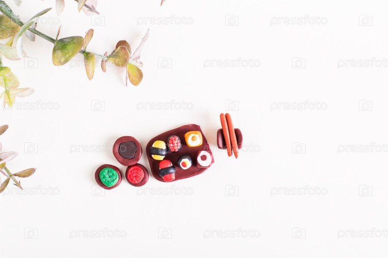Суши ручной работы из полимерной глины на светлом фоне. Детский досуг. Вид сверху