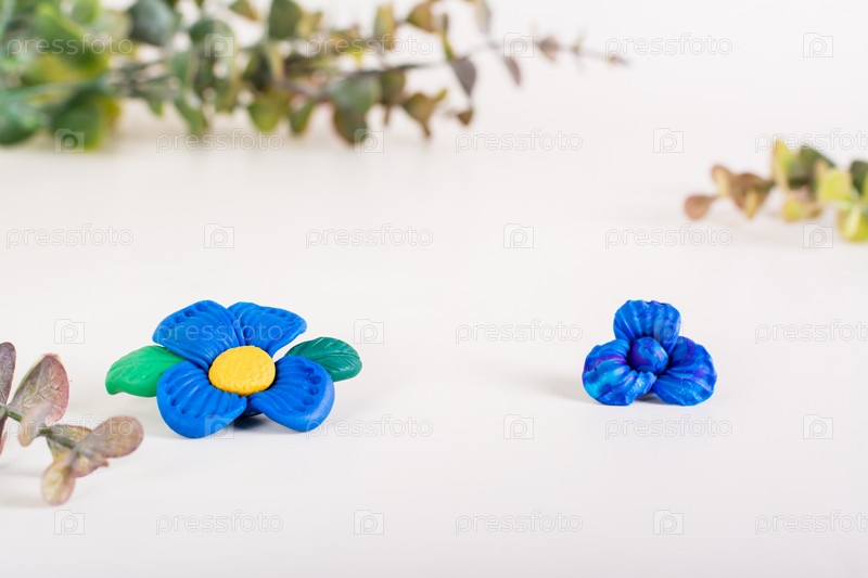 Голубые цветы из полимерной глины на светлом фоне. Ручной декор. Копировать пространство