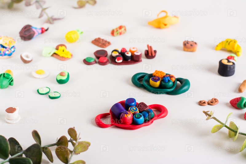 Рулеты на подносе и другая еда из полимерной глины на светлом фоне. Детский досуг