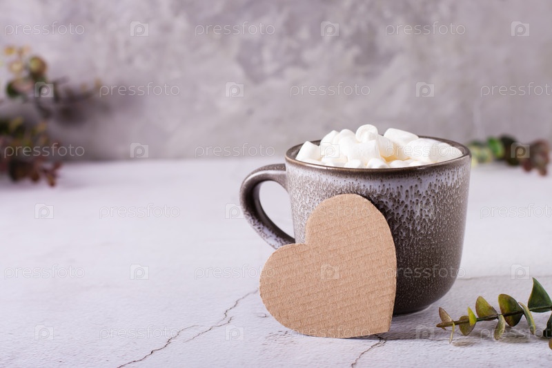 Латте с зефиром в чашке и картонным сердцем на сером столе. Комфорт и хюгге