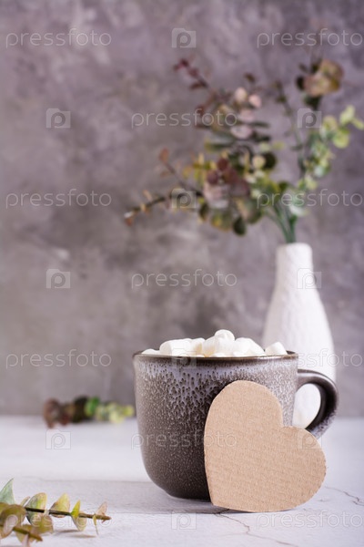 Картонное сердце и чашка какао с зефиром в кружке на сером столе. Вертикальный вид