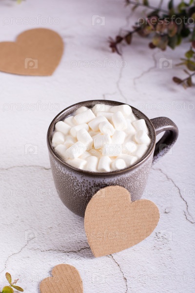 Латте с зефиром в чашке и картонным сердцем на сером столе. Вертикальный вид