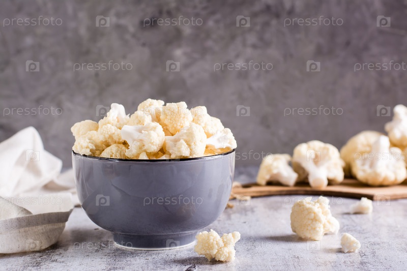На столе стоит миска с сырой цветной капустой. Витамин и вегетарианская пища
