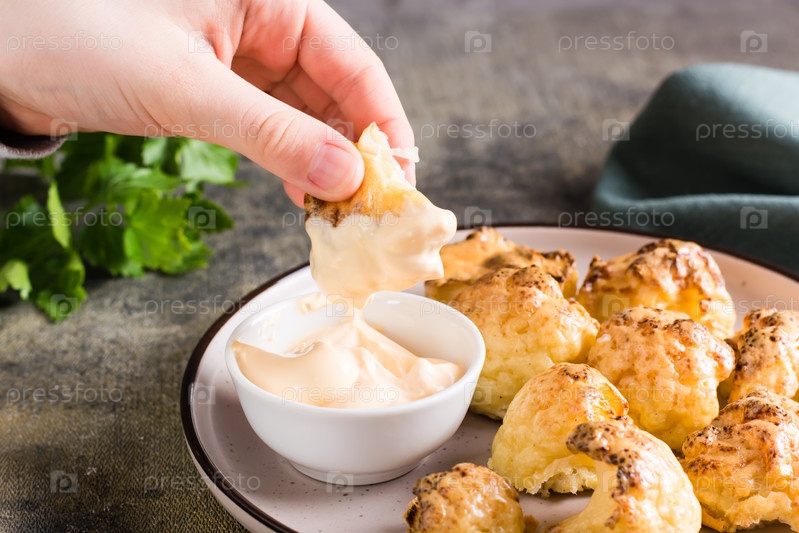 Рука обмакивает вегетарианские крылья буйвола из цветной капусты в соус. Домашняя еда