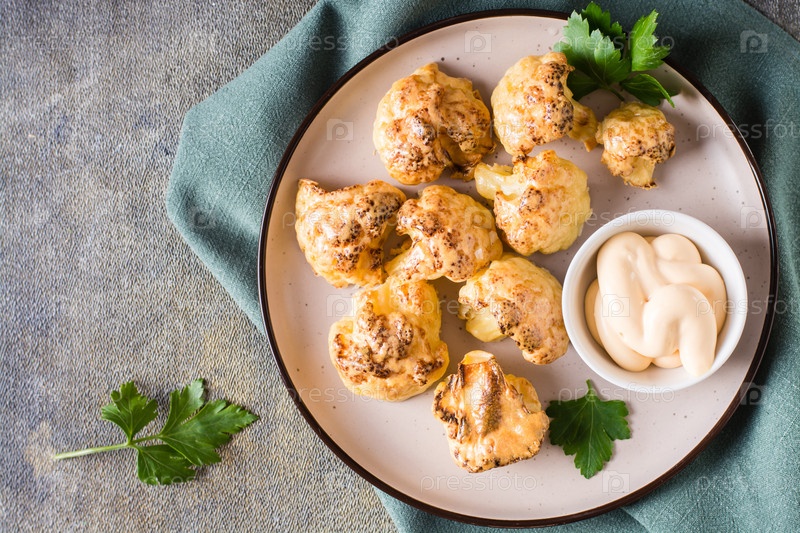 Крылышки барбекю из цветной капусты и соус на тарелке на столе. Вегетарианская еда. Вид сверху. Крупный план