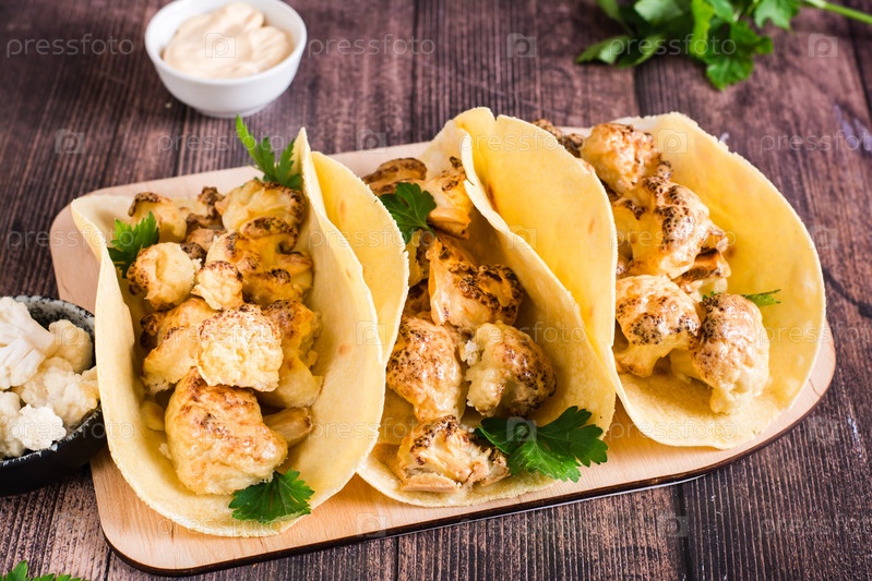 Тако из цветной капусты на гриле с травами на доске на столе. Вегетарианская еда