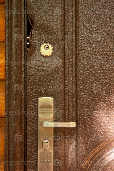Крупный прочный замок сломан в металлической двери крупным планом. Поврежденный дверной замок в загородном доме