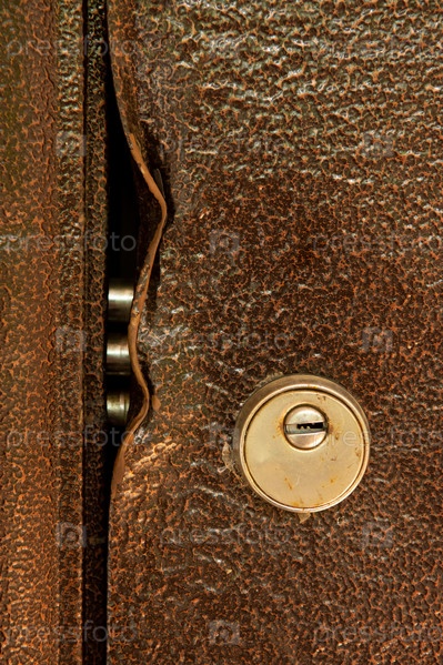 Крупный прочный замок сломан в металлической двери крупным планом. Поврежденный дверной замок в загородном доме