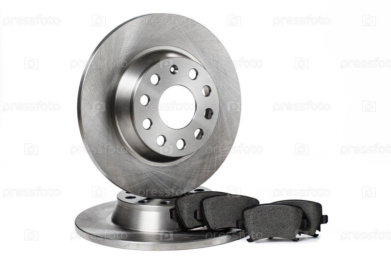 Два новых тормозных диска и комплект тормозных колодок сложены в ряд на белом фоне. отдельные предметы