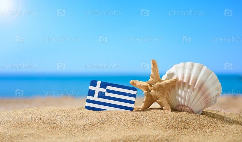 Тропический пляж с ракушками и флагом Греции. Концепция райского отдыха на пляжах Греции