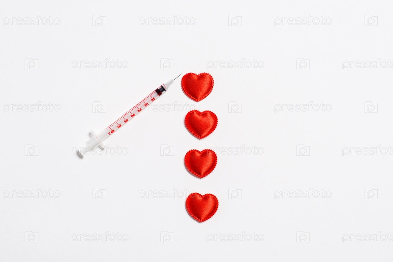 Шприц и несколько маленьких красных сердечек в виде капель крови на белом фоне. Концепция лечения диабета