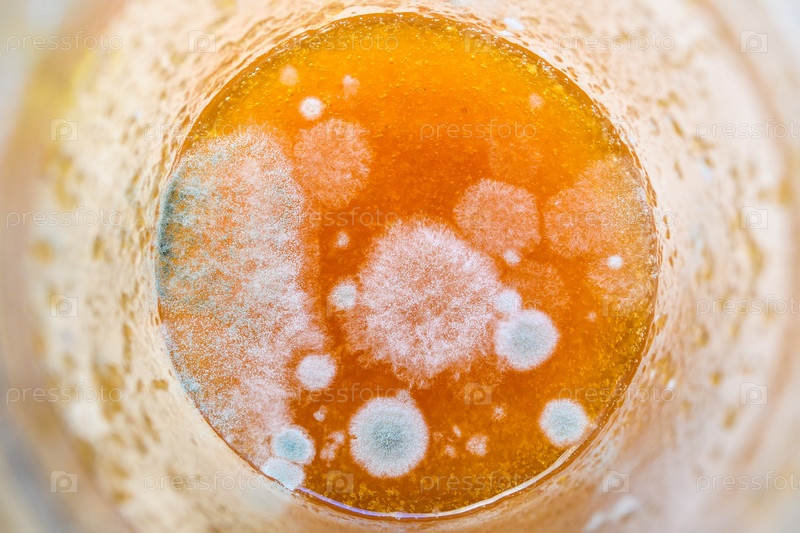 Крупный план плесени на апельсиновом варенье в стеклянной банке
