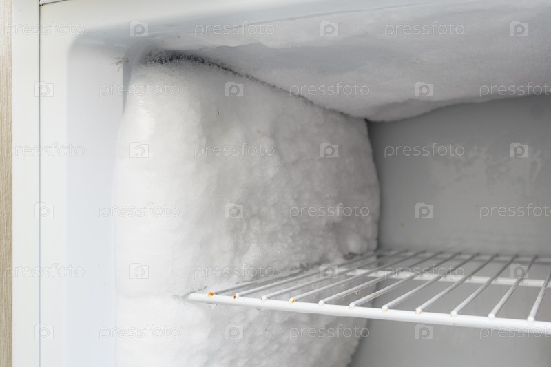 Много инея и льда в морозильной камере холодильника. Плохое качество морозильной камеры. Выборочный фокус на переднем плане