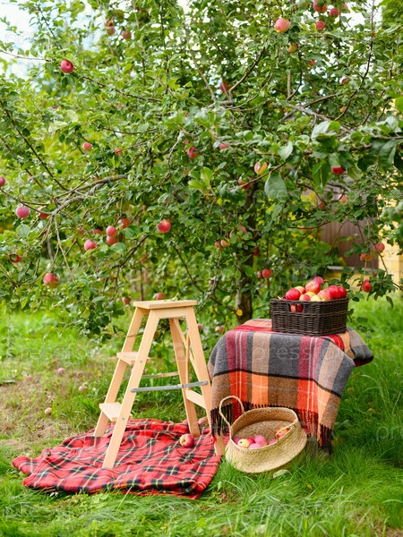 Полная корзина красных спелых яблок и стул для сбора яблок. Концепция сбора яблок в саду. Вертикальная рамка