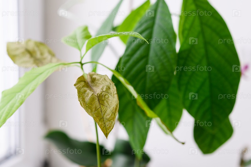 Сухой лист умирающего домашнего растения крупным планом. Селективный узкий фокус. Концепция плохого климата в помещении