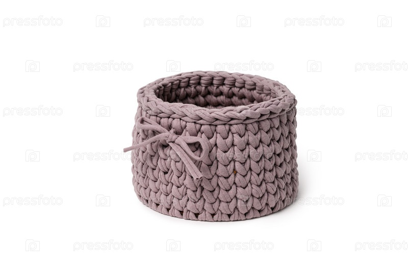 Розовая корзинка ручной работы крючком с декоративным узлом. Изолированный объект на белом фоне
