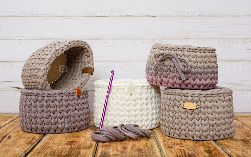 Несколько вязаных корзин на деревянном фоне. Ручная работа. Избирательный фокус на белой корзине