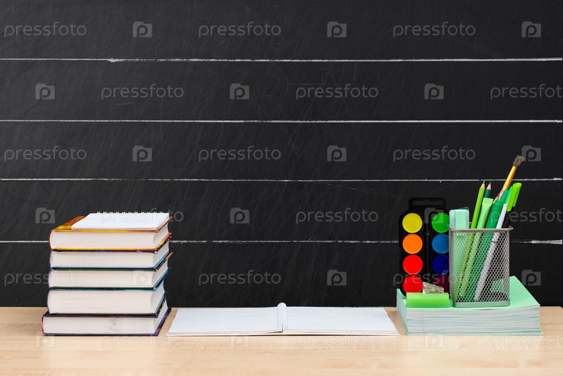 Стопка учебников и канцелярских товаров на столе на фоне школьной доски. Свободное место для текста над элементами