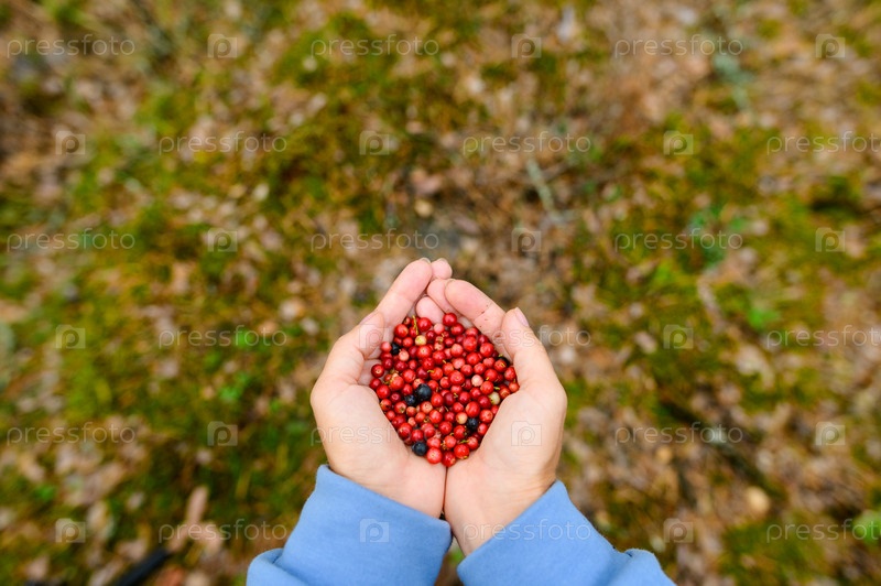 Полные ладони лесных ягод брусники и черники. Свободное место для текста. Селективный фокус на ягодах