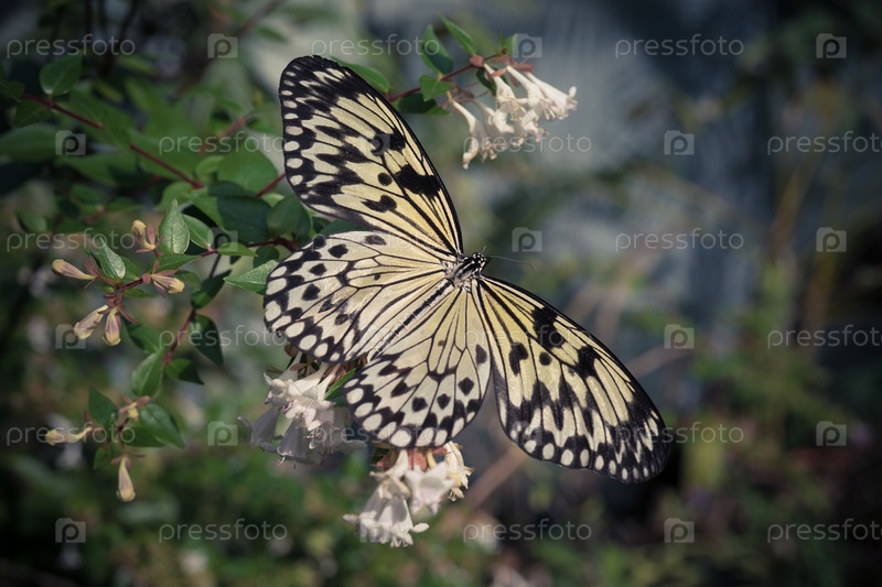 Большая желтая бабочка сидит на кусте с маленькими белыми цветами