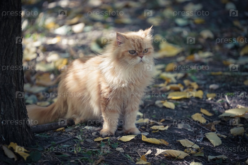 Рыжий кот сидит на земле с осенними листьями