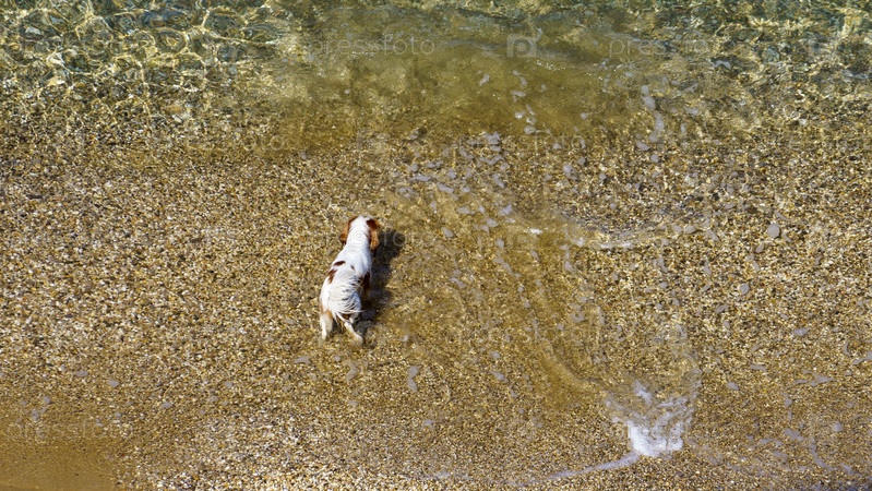 Вид сверху на маленькую белую собачку на пляже