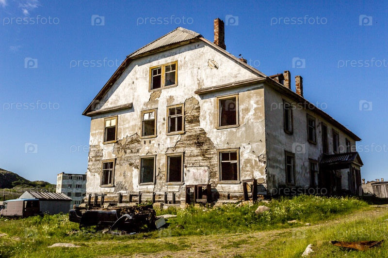 Разрушенный старый заброшенный каменный дом в селе Териберка Кольского района Мурманской области, Россия