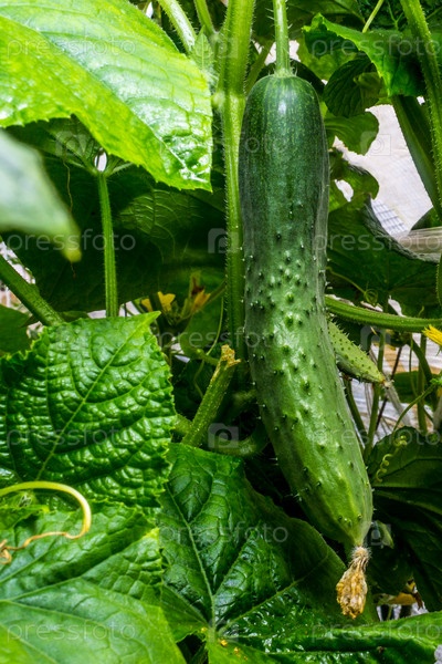 Огурец на лозе в теплице. Молодой огурец в теплице на фоне листьев