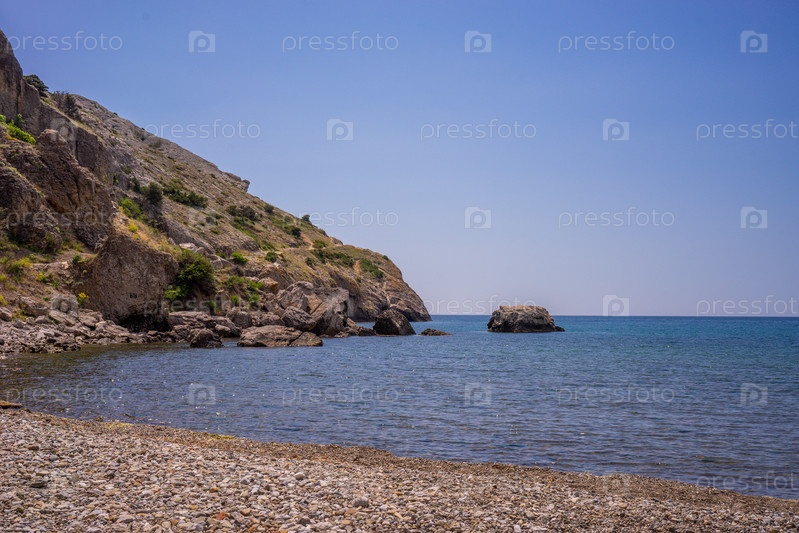 Морской пейзаж со скалами на фоне воды. Судак, Крым