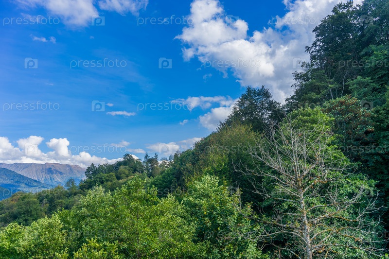 Горный пейзаж с деревьями на фоне голубого неба с облаками