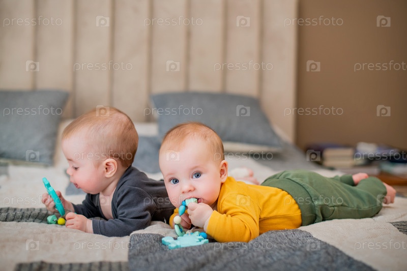 Младенцы-близнецы лежат на диване и грызут прорезывающиеся зубы