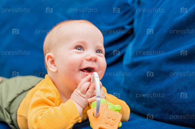 Ребенок в лежит на синем диване, улыбается, держит в руках игрушку-прорезыватель
