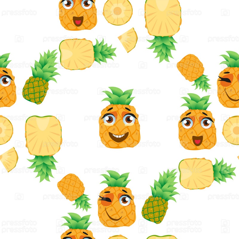 Бесшовный узор из экзотических фруктов ананаса. Смешные милые лица персонажей