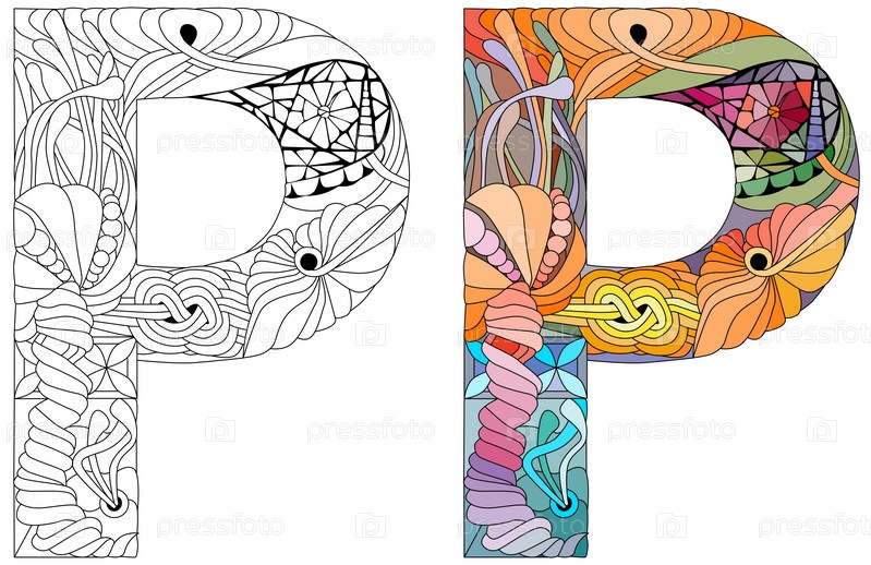 Монограмма буквы P для окраски, гравировки. Векторная иллюстрация. Набор цветов и контуров