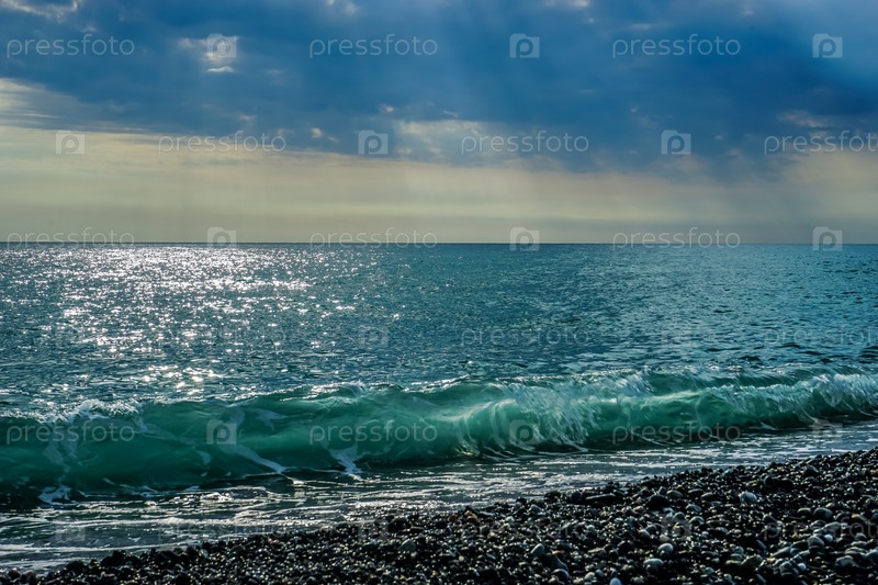 Красивый морской пейзаж с галечным пляжем