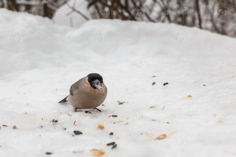 Самка евразийского снегиря сидит в снегу. птица ест семена подсолнечника. Кормление птиц зимой