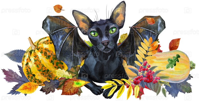 Акварельная иллюстрация милый черный кот с крыльями летучей мыши с тыквой на Хэллоуин