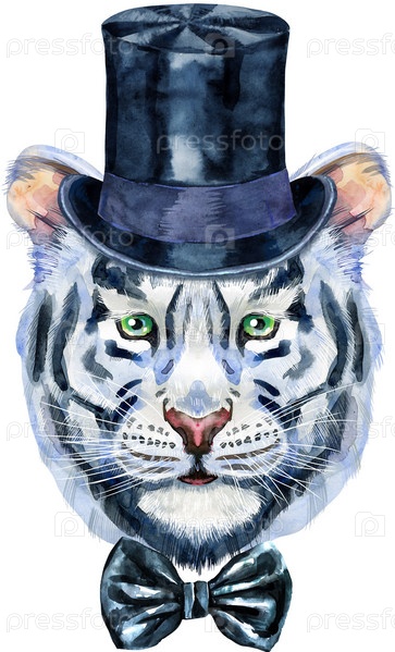 Красочный белый тигр в цилиндрической шляпе. Акварельная иллюстрация диких животных на белом фоне
