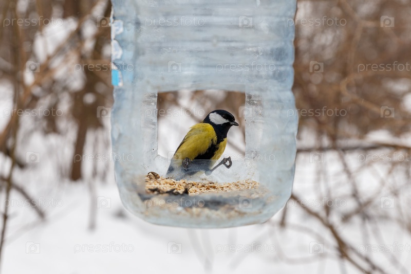 Большая синица сидит в кормушке, сделанной из пластиковой бутылки. Кормление птиц зимой в лесу