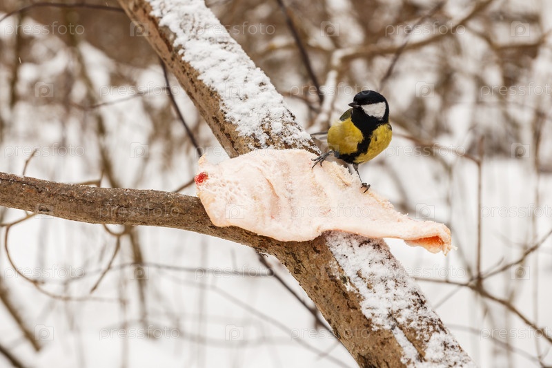 Отличная синица. птица сидит на куске жира в зимнем лесу. Кормление птиц зимой