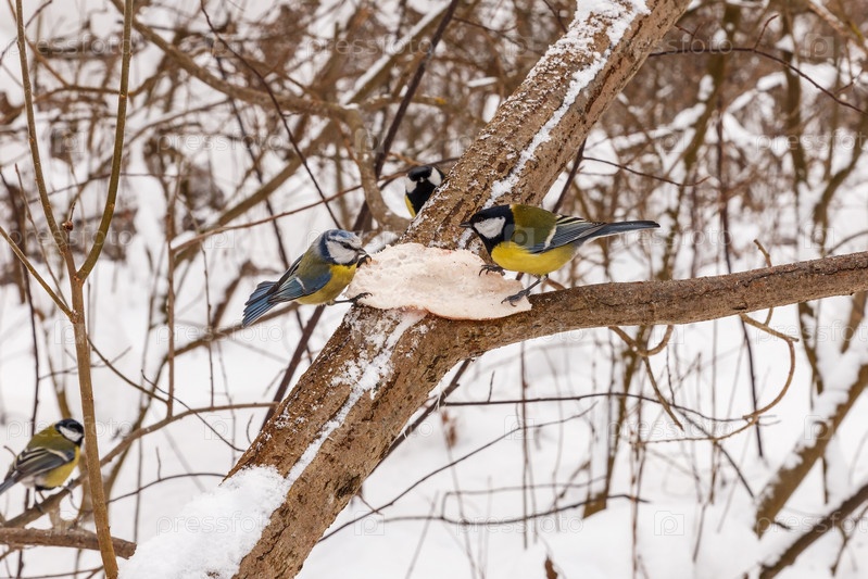 Большая синица и евразийская лазоревка клюют жир на дереве в лесу