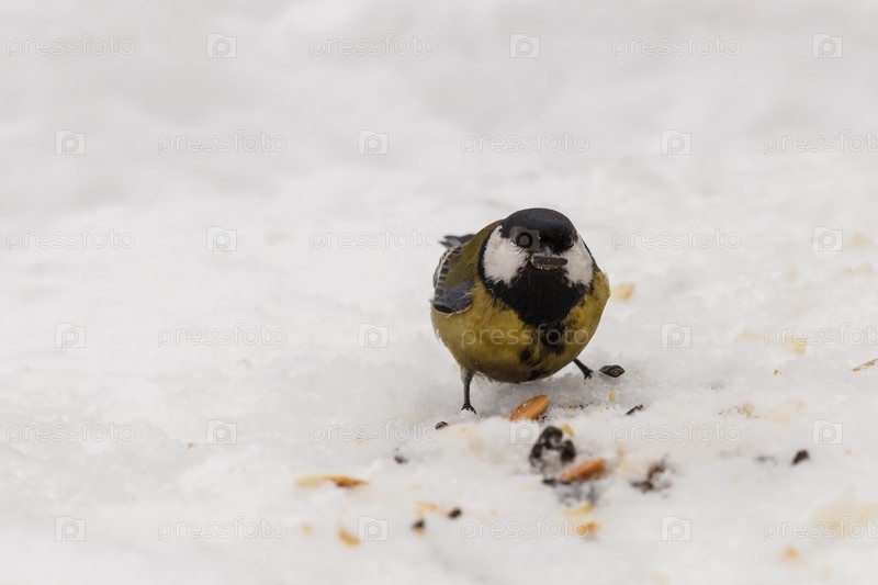 Большая синица. птица ест семечки на снегу