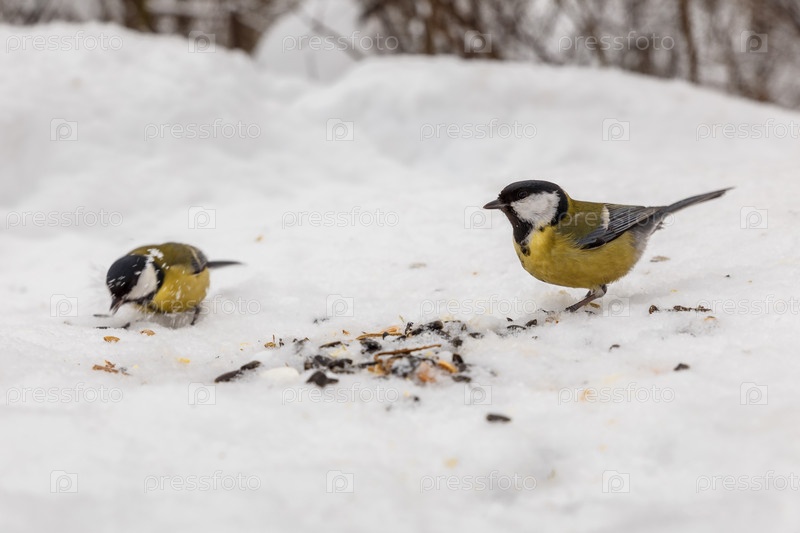 Большие синицы едят семена подсолнечника в снегу. Кормление птиц зимой