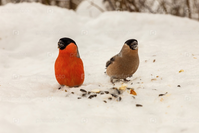 Евразийский снегирь. Мужской и женский. птицы клюют семена на снегу