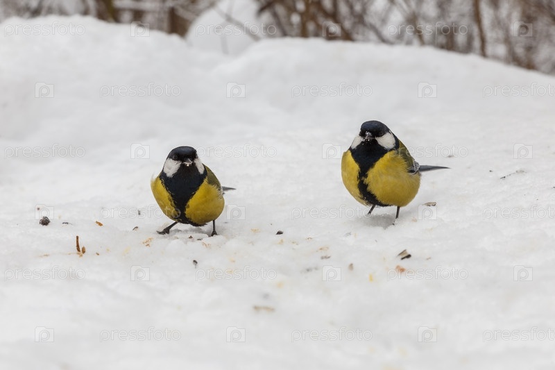 Большая синица. Птицы клюют семечки на снегу. Кормление птиц зимой
